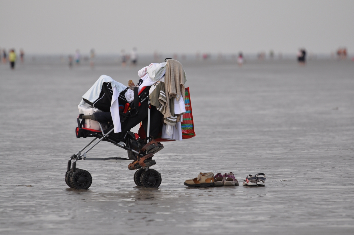 Aufgenommen in St. Peter-Ording von einer Brücke sieht man hier die Spuren von Zutrittsberechtigten (kleine Abdrücke) und widerrechtlichen Läufern (große Abdrücke).